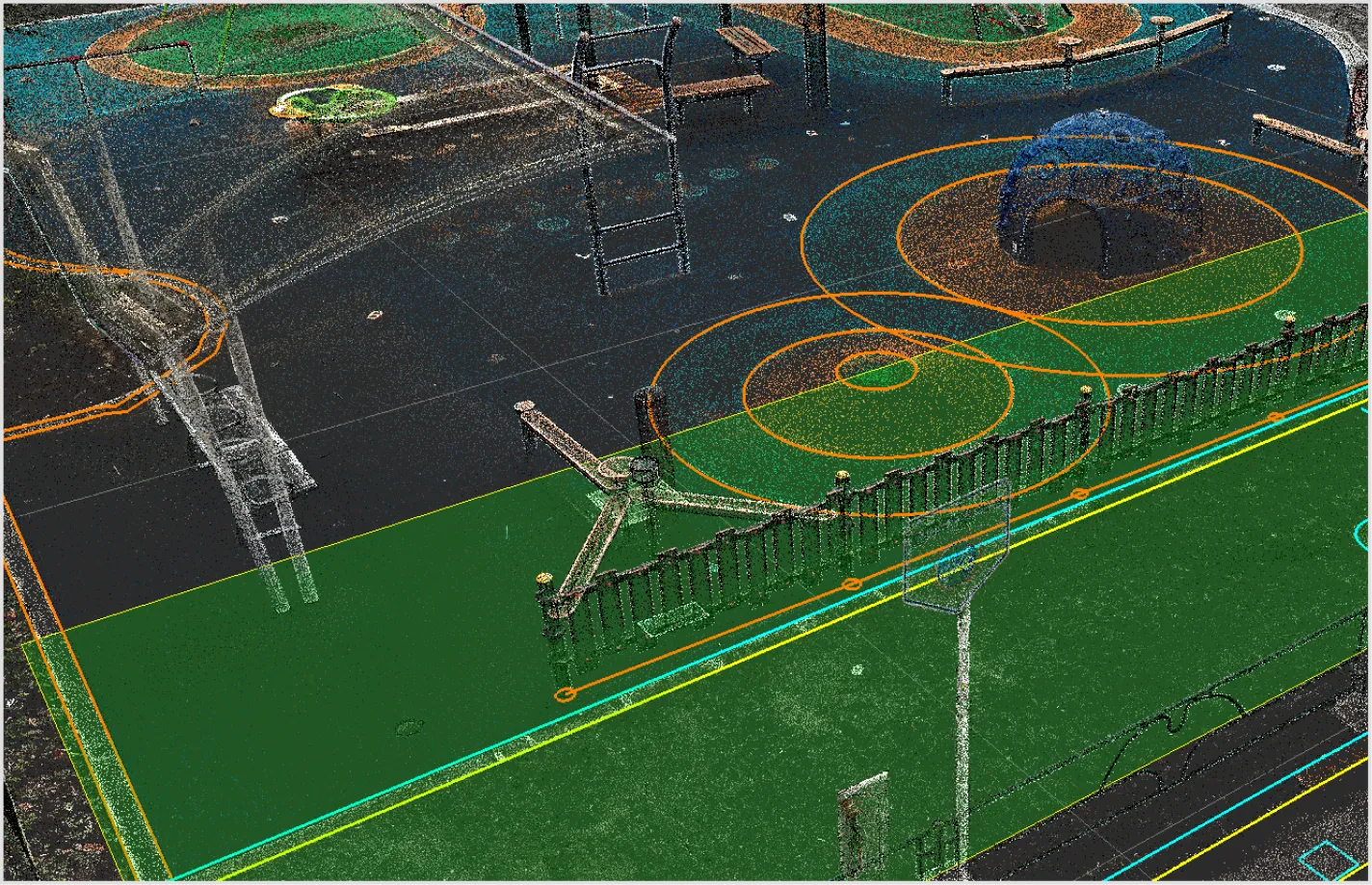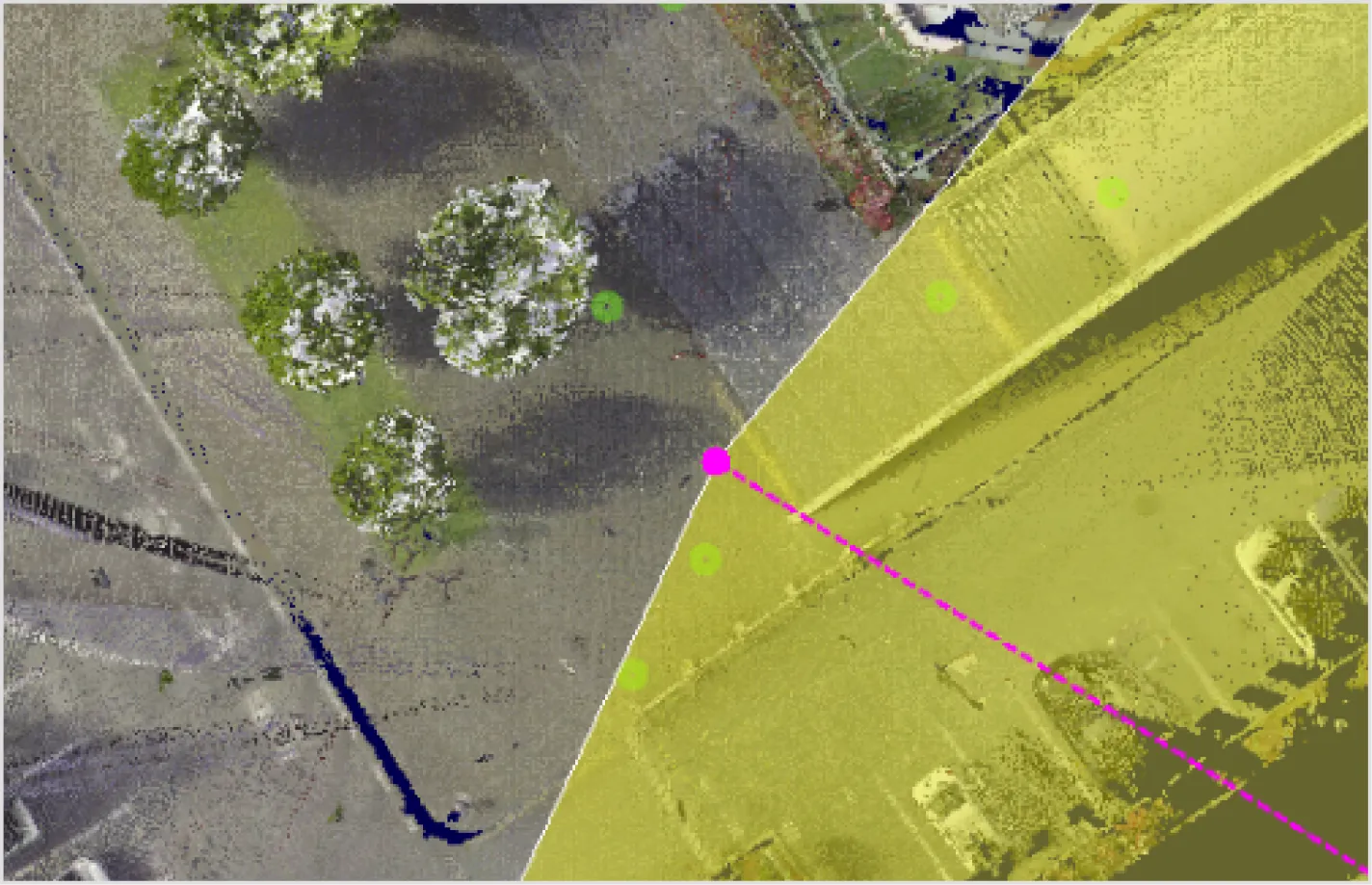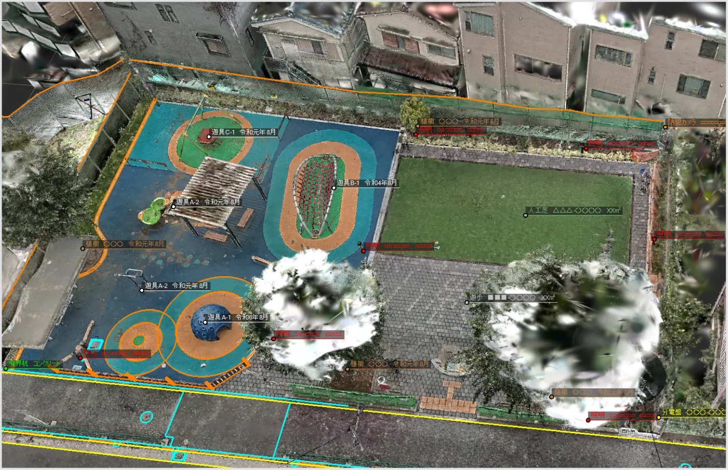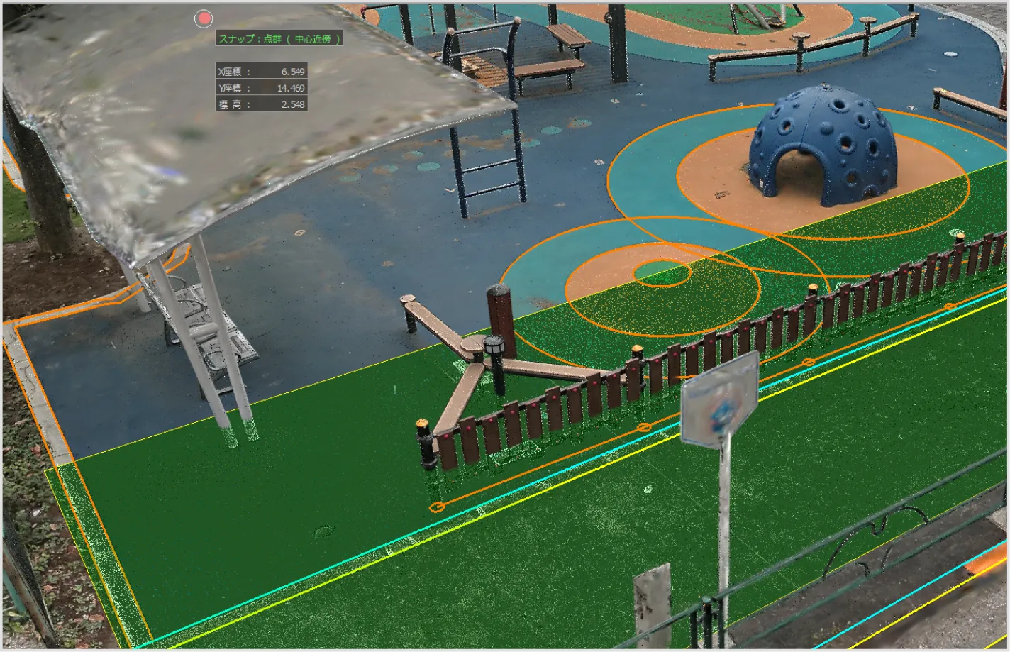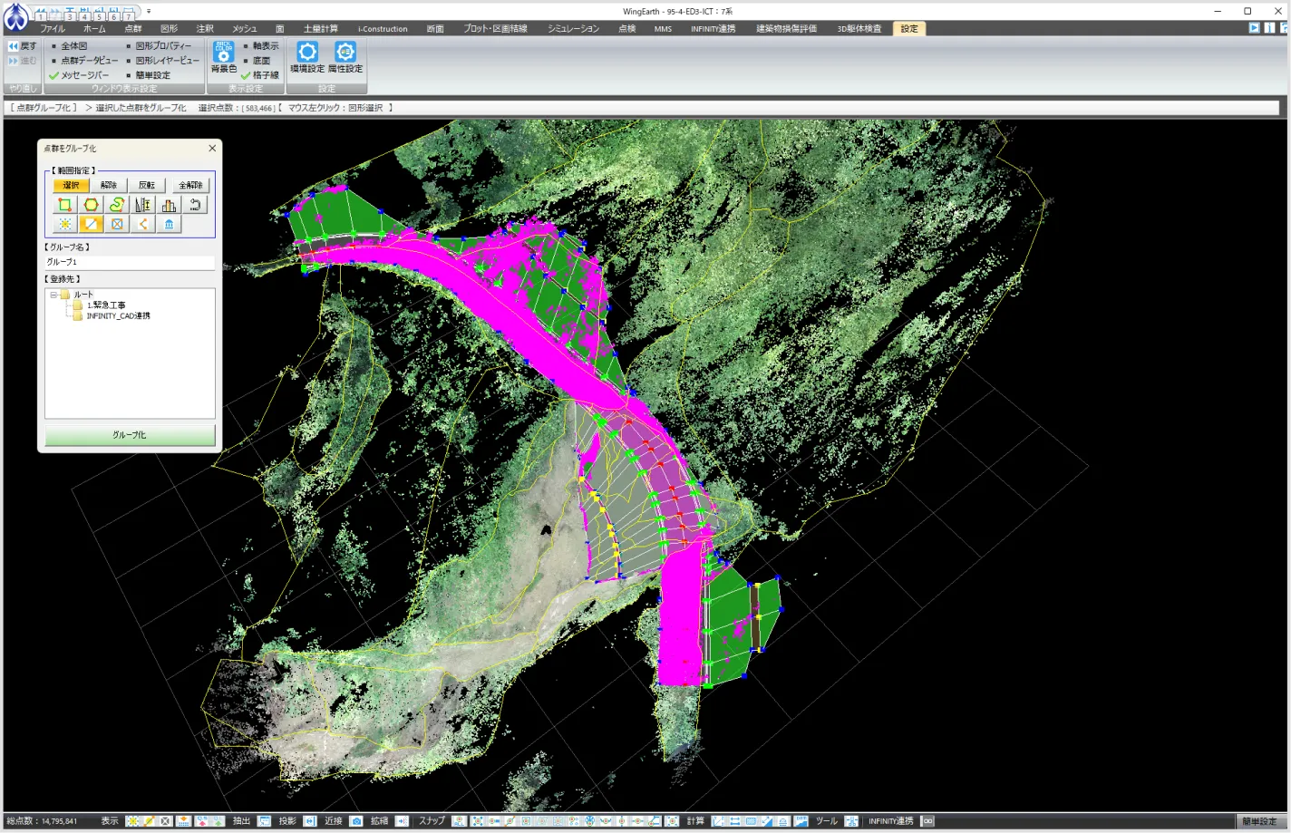 図形・線形・メッシュ・設計データをもとに点群の選択ができるようにしました。 点群を選択するケースは多く、グループ化・グループ分け・削除・フィルタリング等の範囲選択など多岐にわたります。本改訂では、これまで多角形などをクリックすることで点群選択していた作業を省力化し、既存データを生かした点群選択を可能にします。以下に活用のケースを示します。