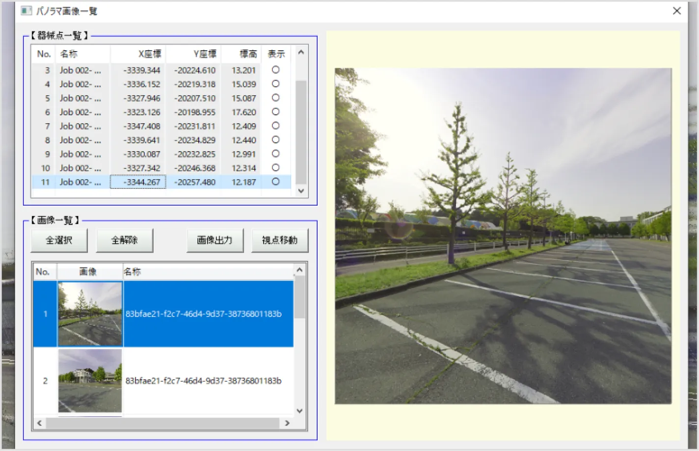 また、全体図でのプロット位置のダブルクリックで器械位置周囲の画像 データを使ったパノラマ投影表示(点群空間との重畳)、取り込んだ画像 のパノラマ一覧表示に対応しました。
